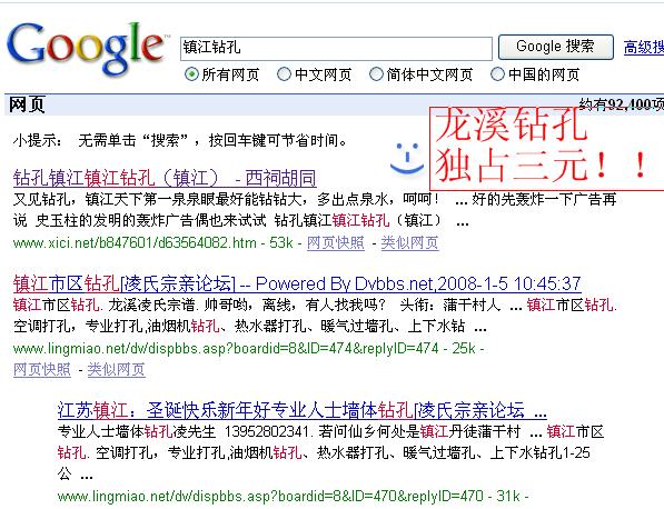 → 雄霸镇江:偶的广告包揽GOOGLE搜索前三名,令竞争对手胆寒!